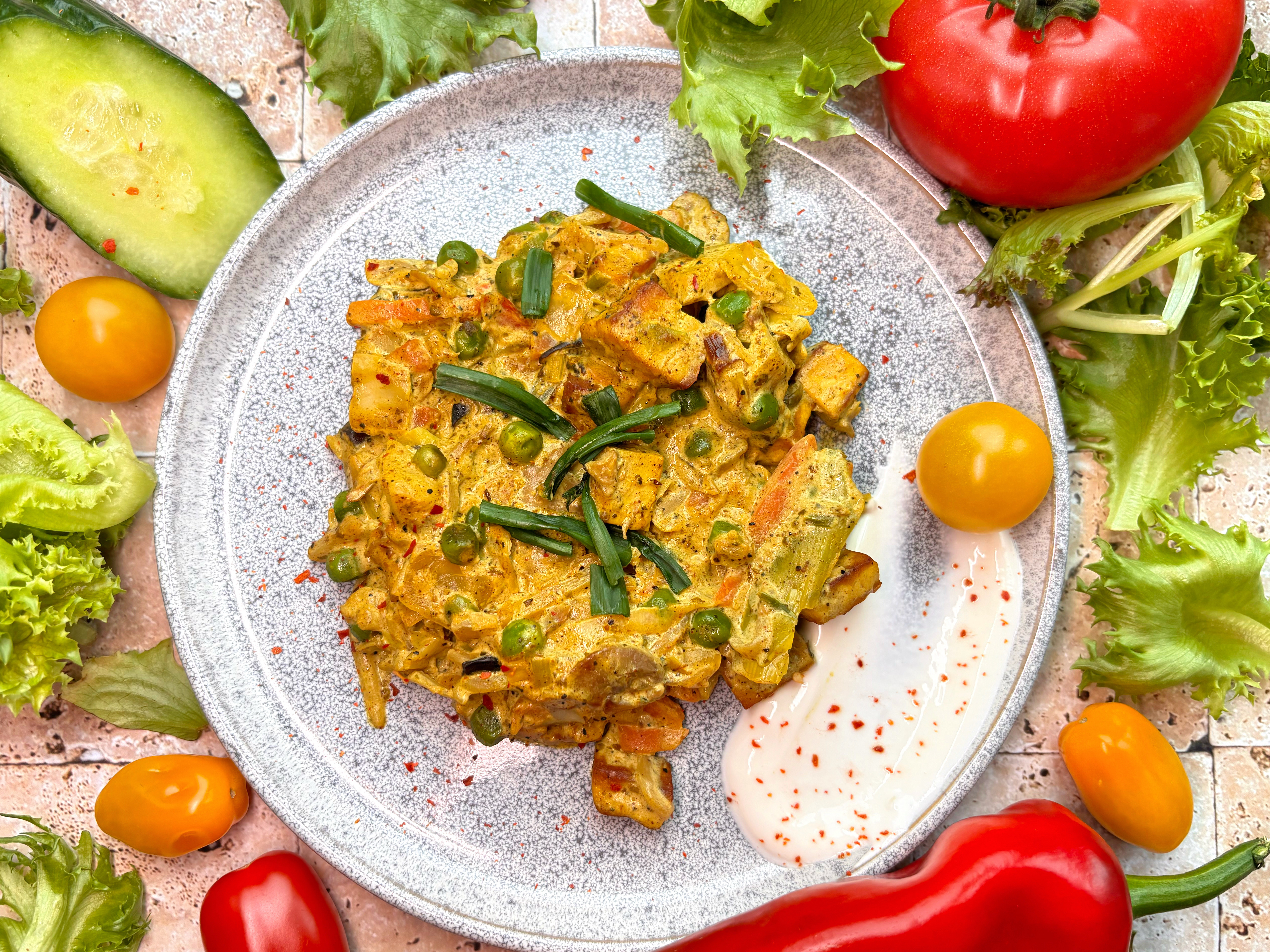 • Dopraw tofu przyprawą curry, solą oraz pieprzem, dokładnie wymieszaj.