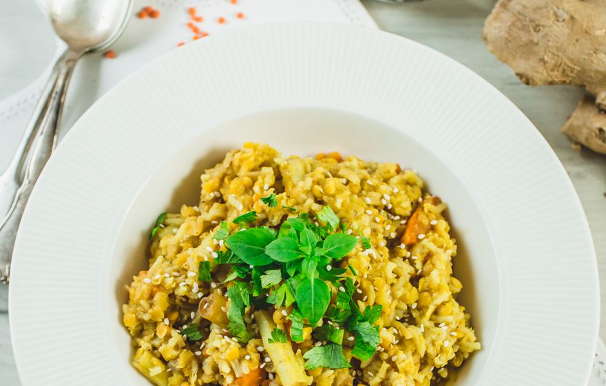 Indyjska potrawa z soczewicy i ryżu z dodatkiem warzyw.