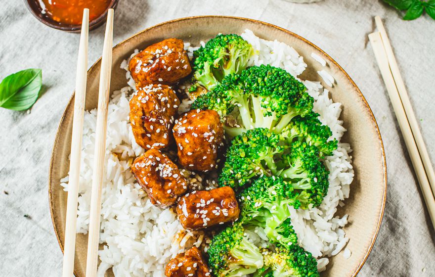 Kurczak na słodko z ryżem i brokułami