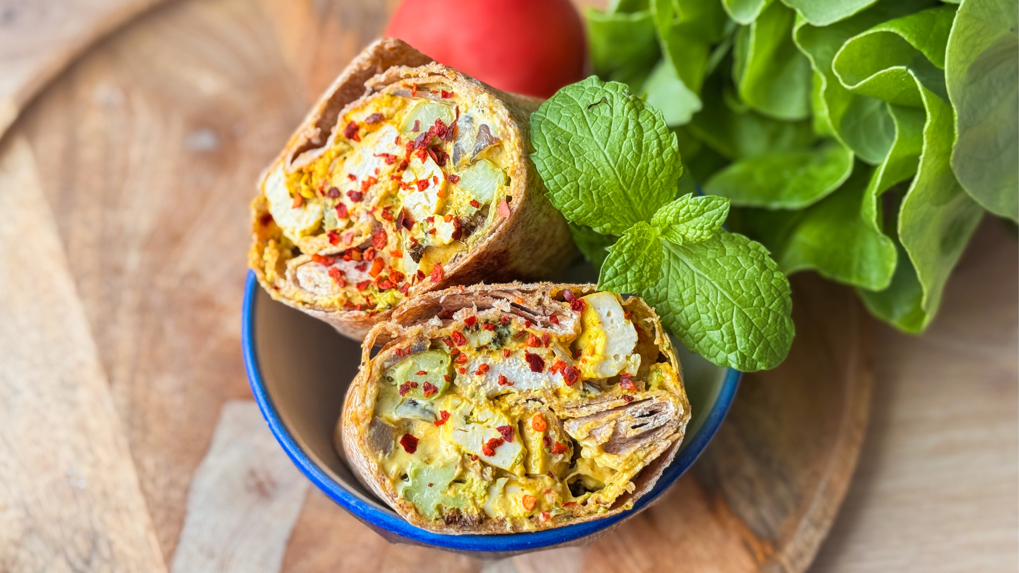 Wrap z pieczonym tofu, kurczakiem, brokułem i curry jogurtowym