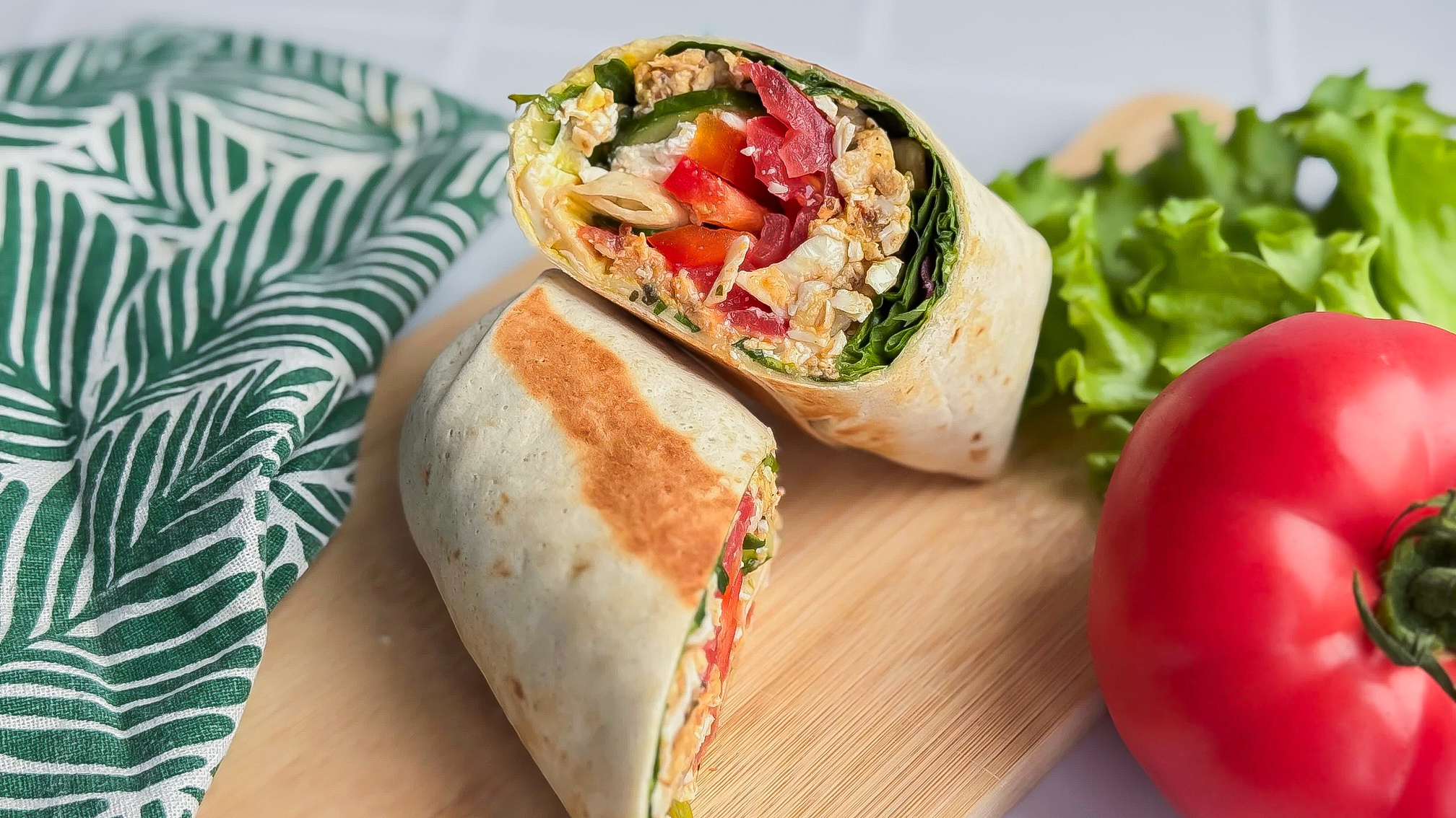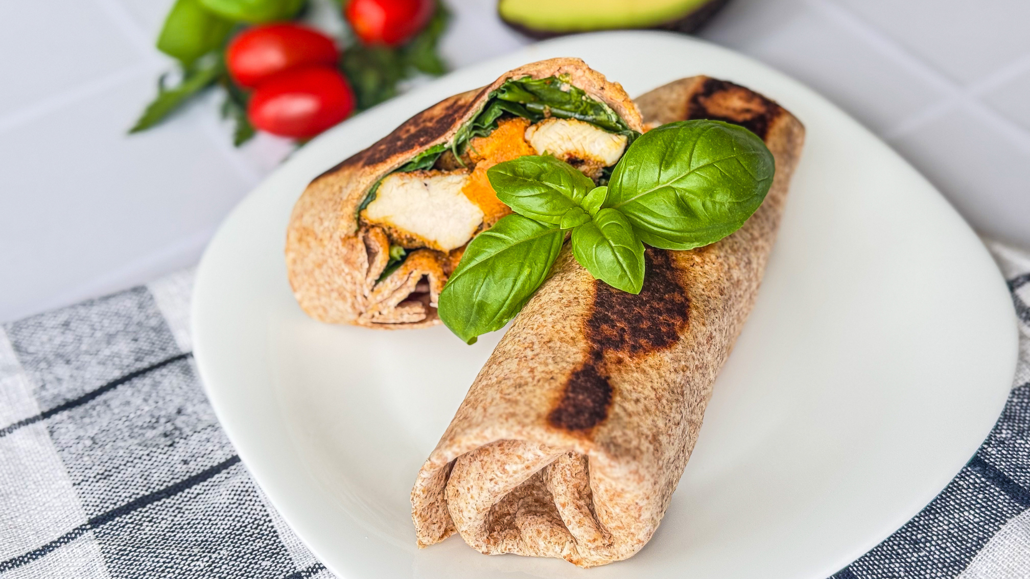 Składniki: • 1 pełnoziarnista tortilla (ok. 60 g) • 100 g filetu z piersi kurczaka • 80 g batata (waga surowa, przed pieczeniem) • 1 garść świeżego szpinaku (ok. 20 g) • 1/4 papryki czerwonej (ok. 40 g) • 1/4 ogórka (ok. 40 g) • Kilka plasterków czerwonej…