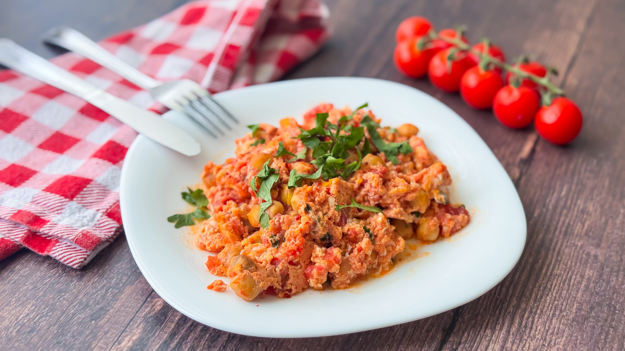Jajecznica z pomidorami z puszki i ciecierzycą