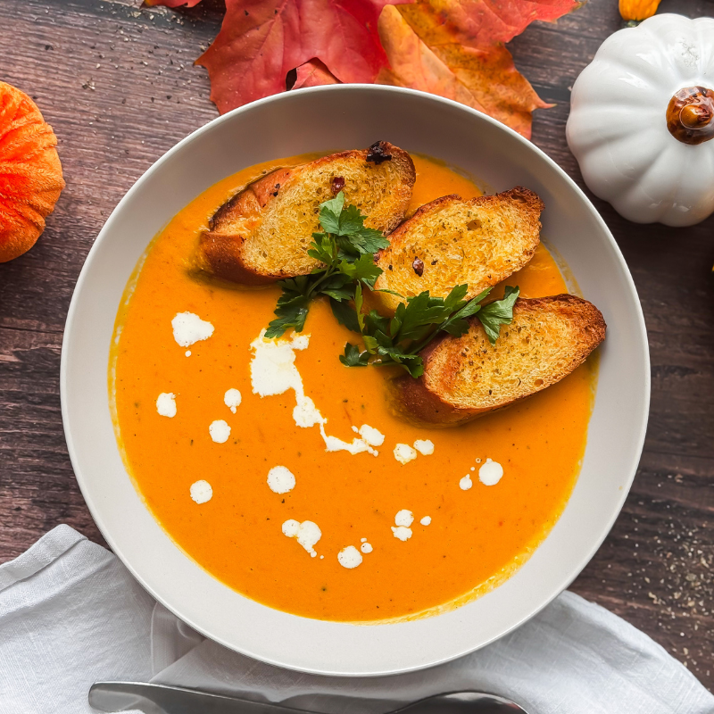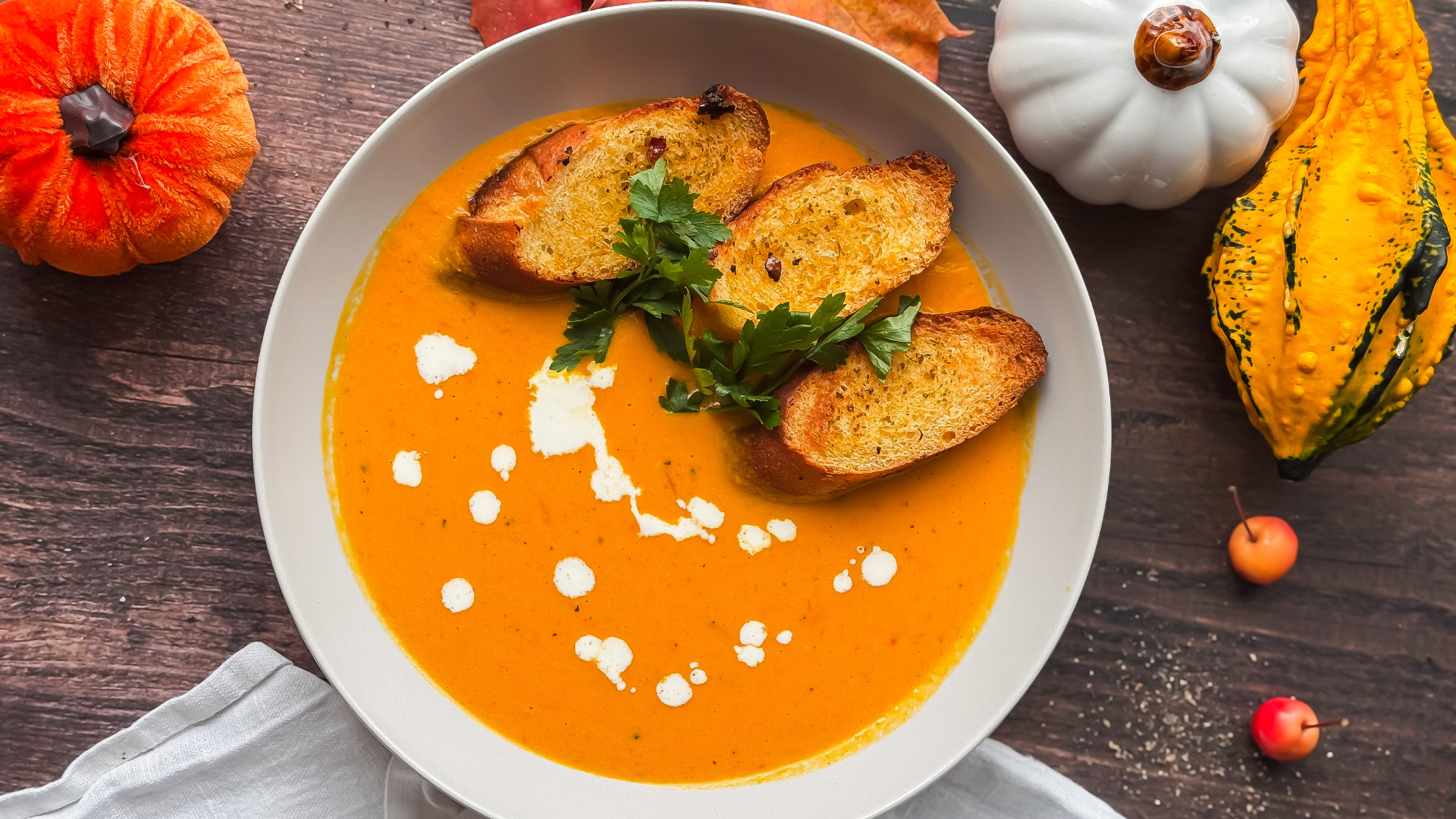 Podawaj gorącą, udekorowaną pestkami dyni, kleksem śmietanki lub oliwą.